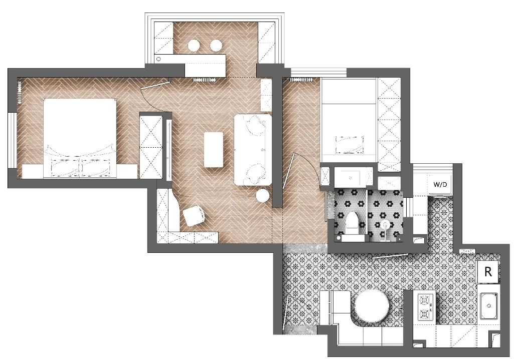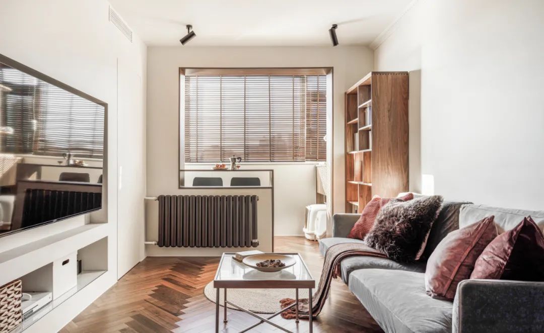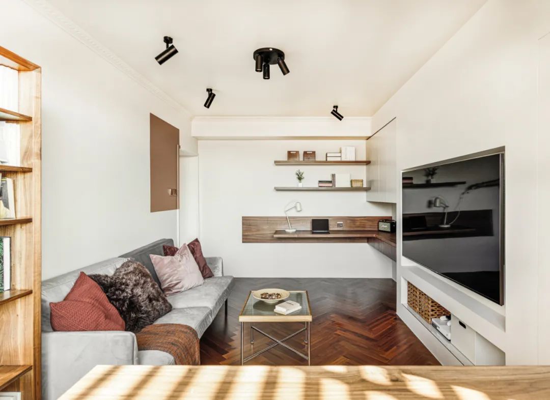 3.客厅和工作台区域通过柜体进行了一定程度的融合,空间更整体,解决了原本门洞为空间带来的问题。