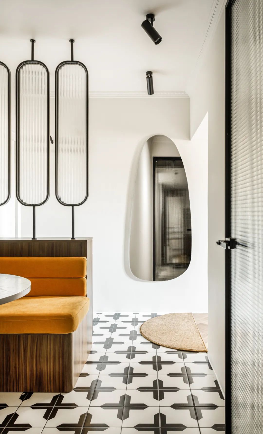 长虹玻璃、黑白地砖、异形穿衣镜,各种元素的拼合,空间丰富而不凌乱。