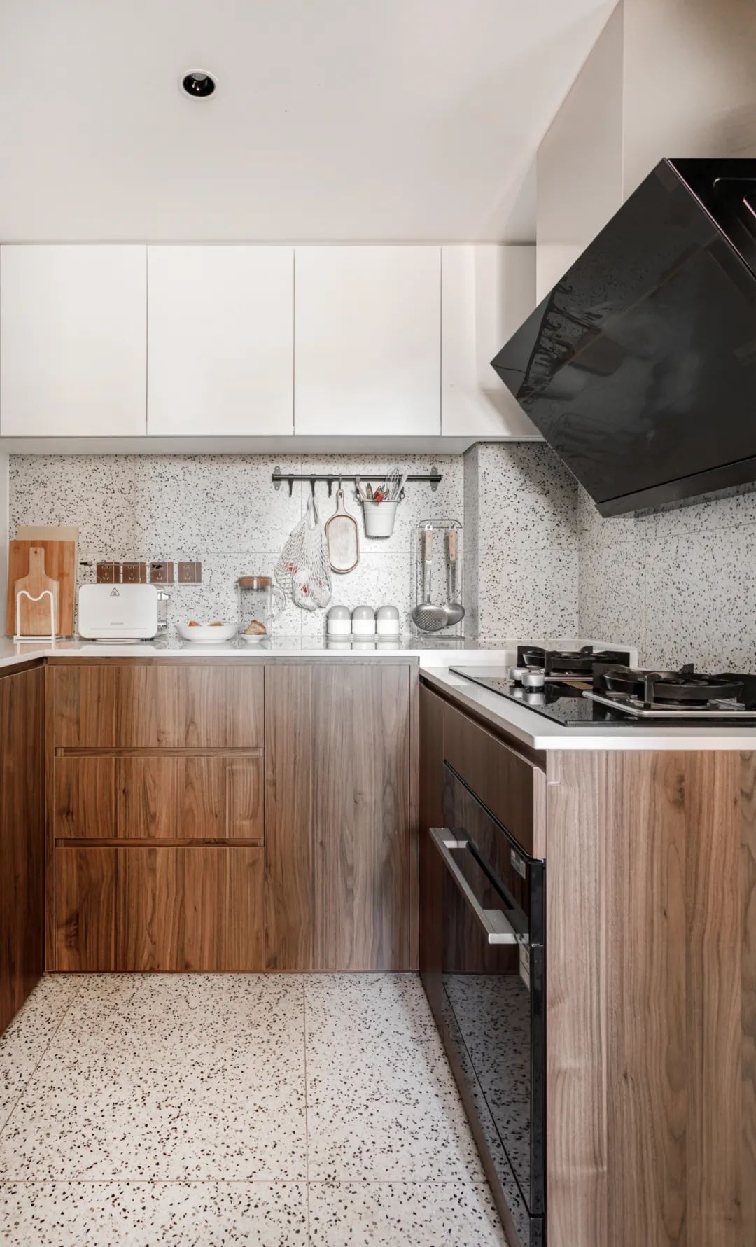 厨房延续了主要空间的配色元素,增加了水磨石作为墙地面的底色。