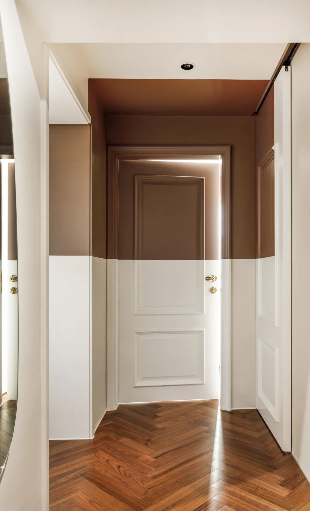 入户后正对的就是走廊,通过拼色处理,将颜色延展至客厅门洞内,也打破了空间的视觉限度,使其有一定的延展性。