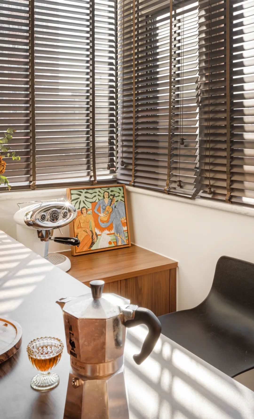 阳台选择了木质百叶帘,可以更好的调控空间的光线。