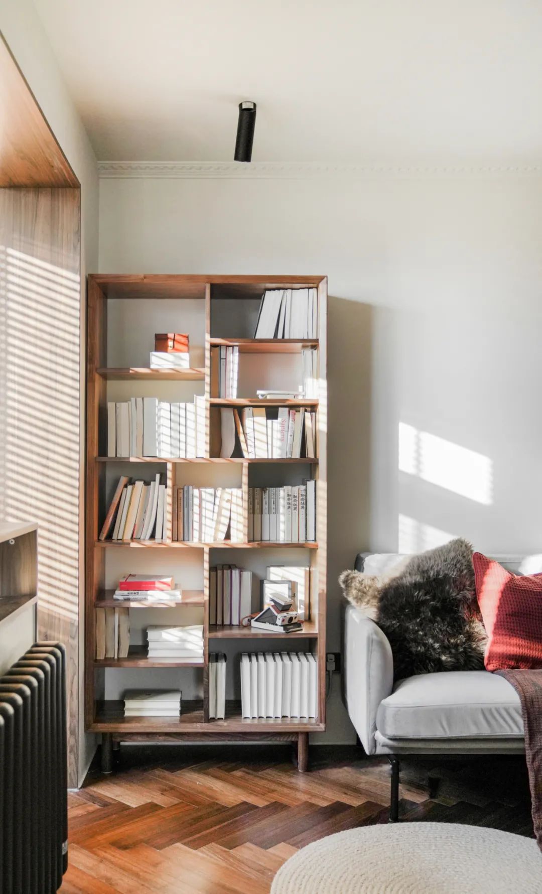 沙发旁边放置了一个木质的书架,随手取书更加方便,增添空间的阅读氛围。