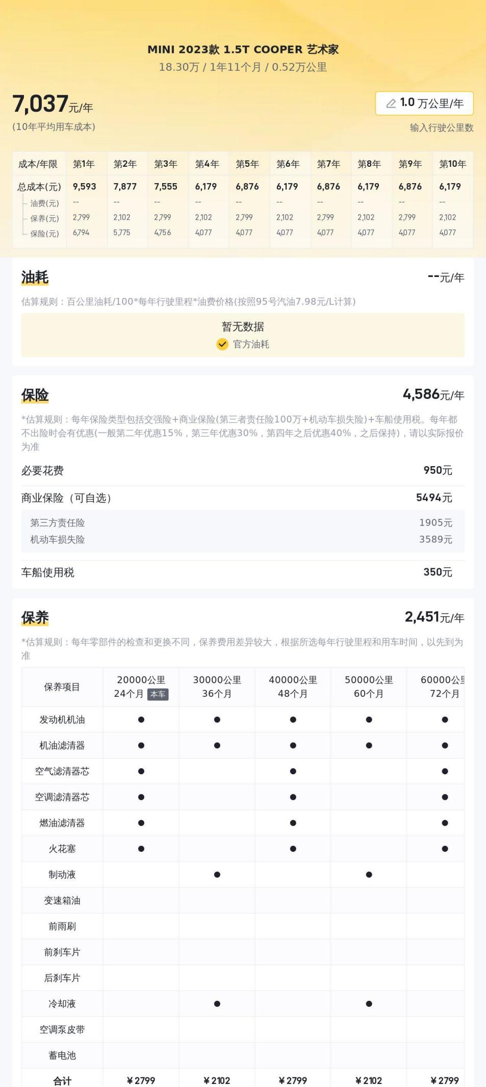 现在,我们来聊聊价格。 18.3万的二手车价格,对于一辆MINI来说,并不算贵。 考虑到它仅行驶了5200公里,几乎就是一辆准新车,这个价格还是比较合理的。 而且,根据懂车帝的数据,这辆车的10年平均用车成本大约在每年1.1万元左右,也在可接受的范围内。