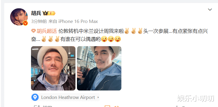 4月8日胡兵又在个人社交平台分享了自己出院后准备出发米兰的状态,看得出胡兵的心态尤其的好,表示:小手术胆切除…… 出院了,精神抖擞,出发米兰。胡兵对镜比耶,看上去恢复的很不错。4月9日,胡兵又分享了一则动态:伦敦转机中米兰设计周我来啦,头一次参展…有点紧张有点兴奋…有谁在可以偶遇。