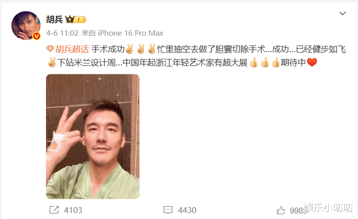 4月6日,胡兵在个人社交平台官宣自己手术成功的消息,称自己忙里偷闲去做了个胆囊切除手术,当时自己已经能健步如飞,并表示自己的下站工作是米兰设计周。当时晒出的照片中,胡兵手上打点滴的滞留针还在。网友也是纷纷赞叹胡兵的敬业,并且都相当担心手术后还高强度共工作身体是否能吃得消,毕竟胡兵已经54岁了!
