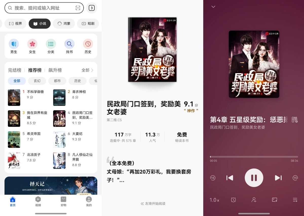 小说频道也是一样,不仅免费,还能“听小说”。洗碗拖地的时候,选个轻松的穿越文或者搞笑爽文,做家务同时还能沉浸听书,干活也没觉得累了。