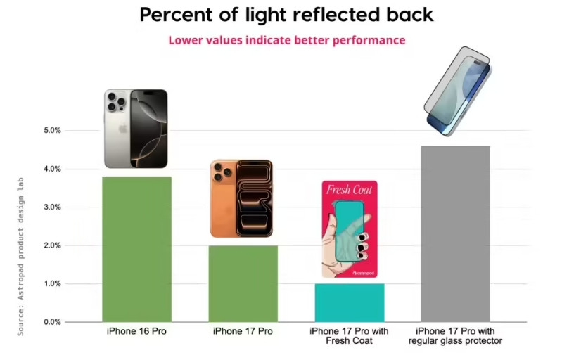iPhone 17 + Fresh Coat(Astropad带抗反射效果的贴膜)反射率是1%;