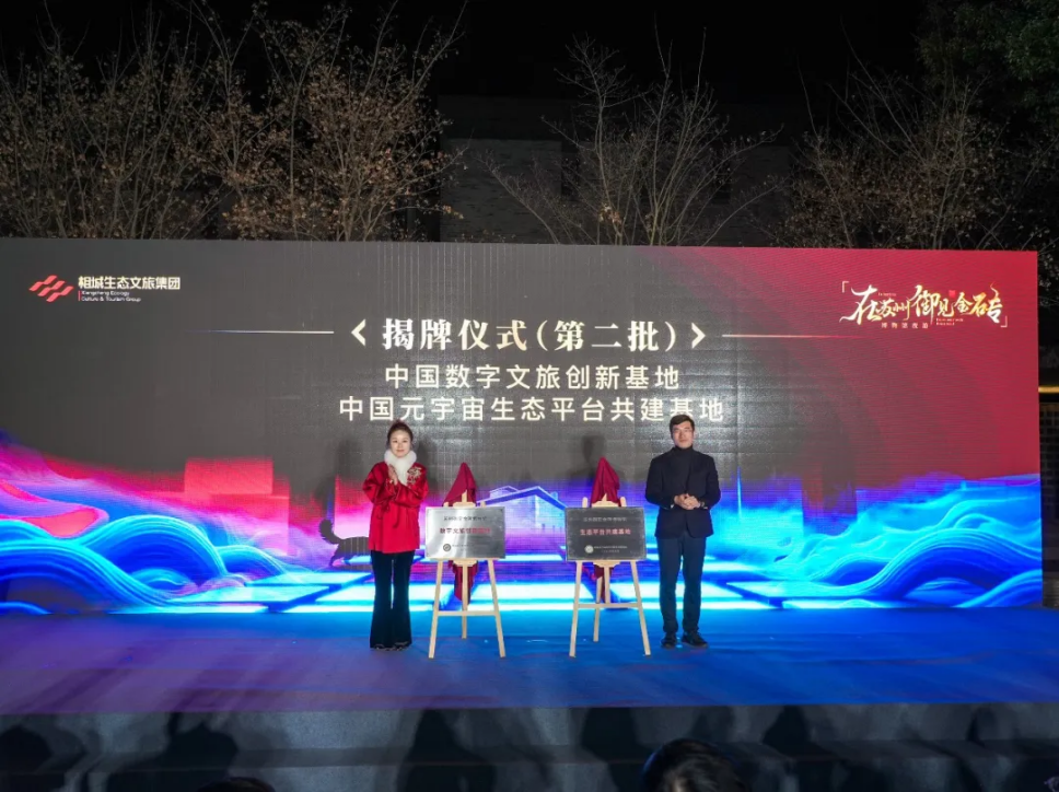 中国电子商会数字文旅专业委员会代表王冠与相城生态文旅集团副总经理施晓明,为“中国数字文旅创新基地”“中国元宇宙生态平台共建基地”揭牌。