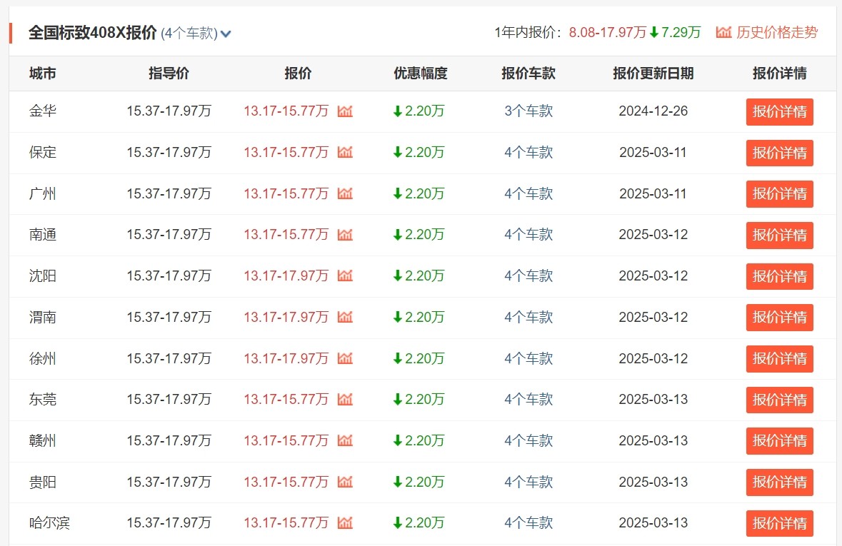 先来看价格,标致408X的厂商指导价是15.37-17.97万元,对于一台中型轿跑车来说,这样的定价其实也不算很高。而且,目前标致408X在终端拥有2.2万元起步的优惠,这也就意味着,咱们在全国大部分的地区都能以13万出头的价格就买到这车,那这显然是颇具性价比的。