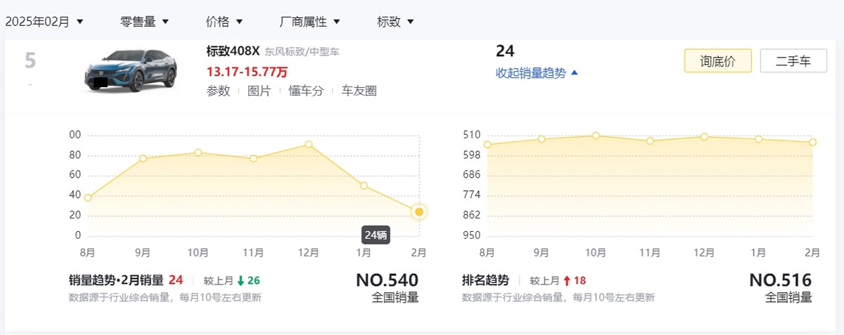 兄弟们,我实在是不懂,像标致408X这样的一款合资中型掀背轿跑车,现在终端已经只需要13万的价格就能够买了,却仍然在2月份仅卖出去了24辆新车。