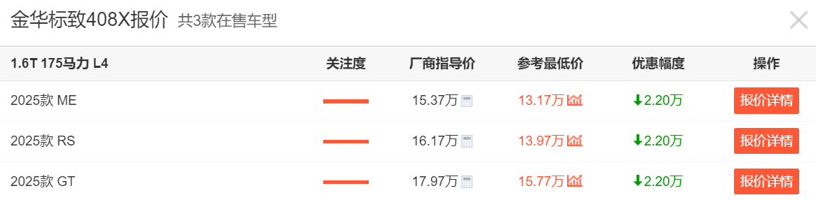 总之,要论车型本身,标致408X真的是一台好车,要设计有设计,要动力也不差,而且价格还有2万多的优惠,这放在以前可不敢想。但只可惜,现在的国人更多愿意倾向于去购买新能源车,即便是买油车,也更想去买像丰田、本田、大众这样大厂出品的车型,所以,最终留给像东风标致408X这样车型的市场空间自然也就少之又少了。最后,你会为了这台13万多就能买到手的合资中型轿跑而去买单吗?评论区里留言说说看。(文/优视汽车 大卓 )