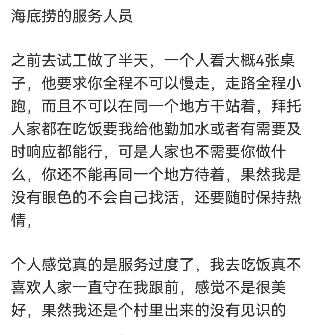 海底捞服务员。服务行业都不好做,要有精力,有耐心。更让人难受的不是身体上的劳累,是会受委屈。