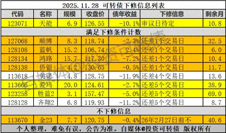 顺博转债、蓝帆转债、鸿路转债、侨银转债还差一个交易日满足下修条件,就看28日盘后有没有下修惊喜。