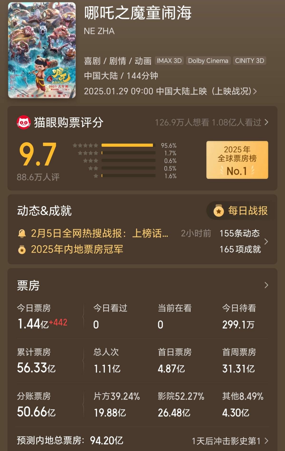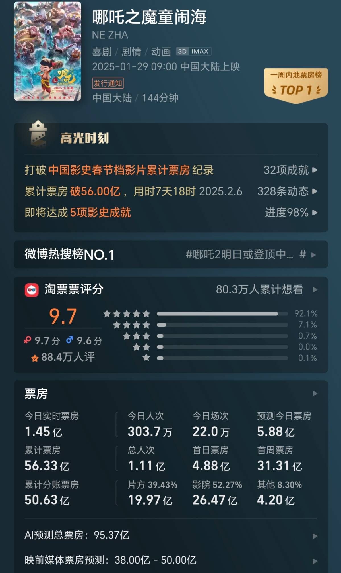 《哪吒之魔童闹海》依然火爆,初八日票房6.48亿元,较初七下跌25%,占了大盘票房的近75%。