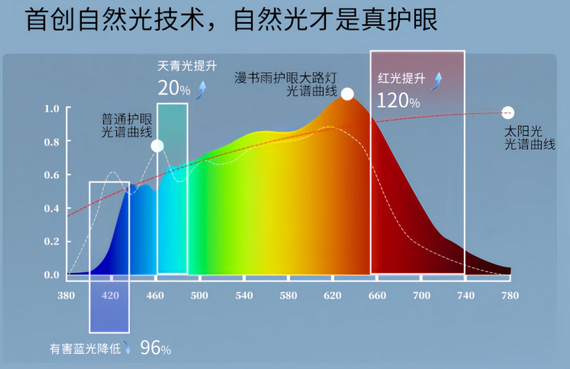 漫书雨星光Pro的灯珠是进口普瑞高品质灯珠,搭配漫书雨首创自然光全光谱技术后,其光谱中有害蓝光含量比RG0水平还要低96%,同时补充了足够的有益红光、天青光,在杜绝蓝光风险的同时促 进眼睛血液循环,减少用眼疲劳,客观上降低近视发生概率。