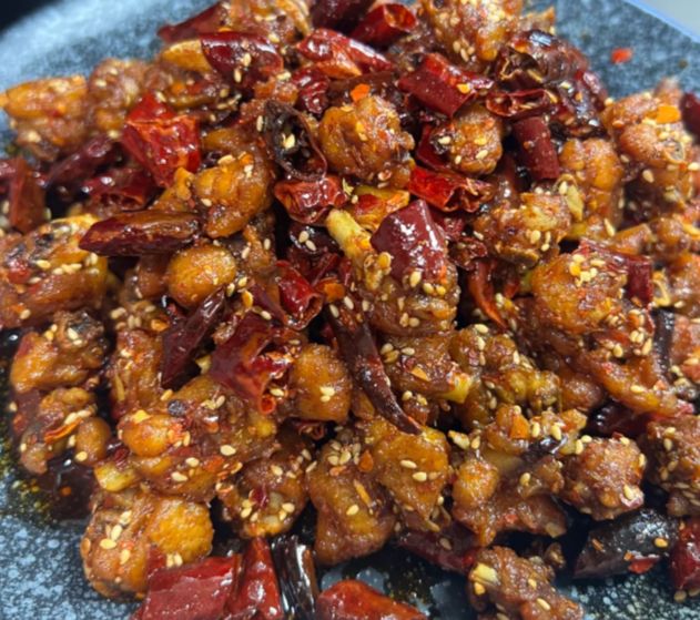 锅里倒油,比平时炒菜多些,烧到五六成热,筷子放进去冒密集的泡,就可以下鸡肉了。肉丁分两次下,免得油温骤降。中小火慢慢炸,炸到表面金黄、边缘焦脆,用漏勺捞起来能听到“哗啦”的响声,就差不多了。捞出沥油,把锅里的油倒出来只留底油,小火炒香姜蒜,然后放花椒和干辣椒——辣椒后放是为了防止炒糊,炒到辣椒颜色变深、香气冲鼻子的时候,倒回鸡肉。这时候转大火,快速翻炒,加一小勺糖提鲜,一点生抽沿着锅边淋下去激出酱香。临出锅撒葱段和白芝麻,再翻两下就好了。