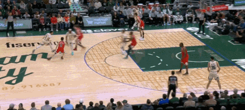 雄鹿左侧的side zoom发起,罗林斯借格林掩护和西姆斯手递手接球,利用威廉姆斯没有提上延误接球出手三分命中。
