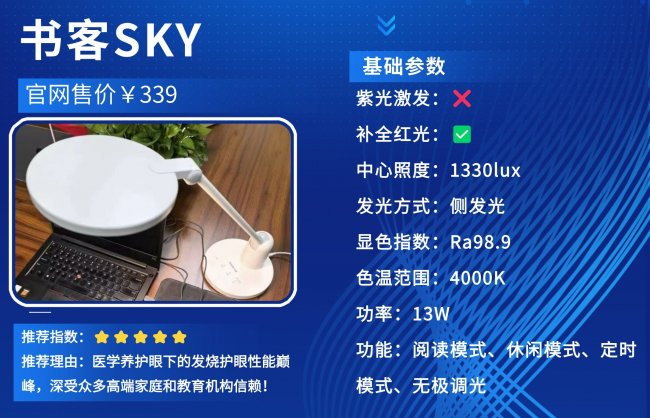 护眼灯品牌排行前十名有哪些?书客始终坚持一条更难走的路:以医学级光环境养护标准为底线,从高显色低蓝光灯珠的严苛筛选,到类自然光谱驱动系统的定制调校,再到多重光学防护结构的迭代设计,实现了缓解81%的用眼疲劳以及降低90%的近视风险,真正以医学逻辑和光学工程打造可验证的护眼效果。