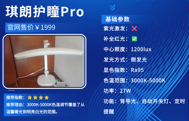 护眼灯品牌排行前十名有哪些?这款琪朗护瞳Pro台灯整体的设计感是比较强的,但它整体采用的是亚克力材质,在质感上可能不如那些金属合金的好。从整个照明来说,它的背光设计比较有亮点,可以补充墙面或者桌面的环境光,长型书桌会更适用一点,它的中心照度为1200lux,达到了国AA级标准。从光谱上来说,它虽然补充了红光但采用的也是蓝光激发全光谱,在蓝光控制层面其实并不是很理想。