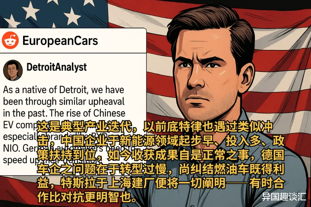 美国网友@DetroitAnalyst从市场角度点评称:“这是典型产业迭代,以前底特律也遇过类似冲击,中国企业于新能源领域起步早、投入多、政策扶持到位,如今收获成果自是正常之事,德国车企之问题在于转型过慢,尚纠结燃油车既得利益,特斯拉于上海建厂便将一切阐明——有时合作比对抗更明智也。"