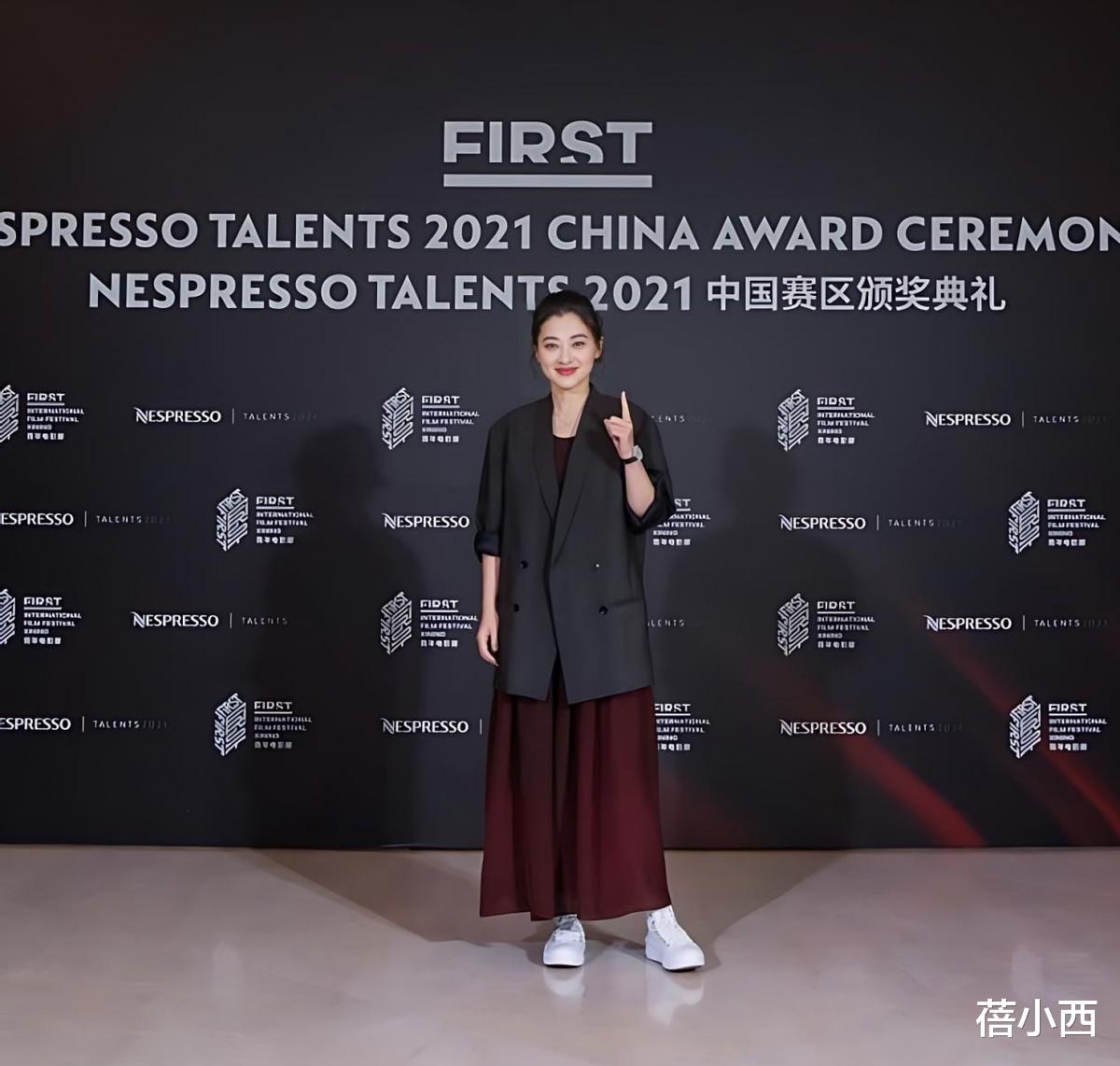 在活动中,梅婷曾身着黑色西装搭配酒红色长裙,脚踩白色运动鞋,用混搭造型让人感到了眼前一亮。这一件黑色西装挺括有型,可以彰显出干练与自信,自带一种职场女强人的气场。下半身的酒红色长裙则为整体造型增添了一抹温柔与浪漫的色彩,宽松的裙摆设计在走动间摇曳生姿,还巧妙地修饰了身材线条。