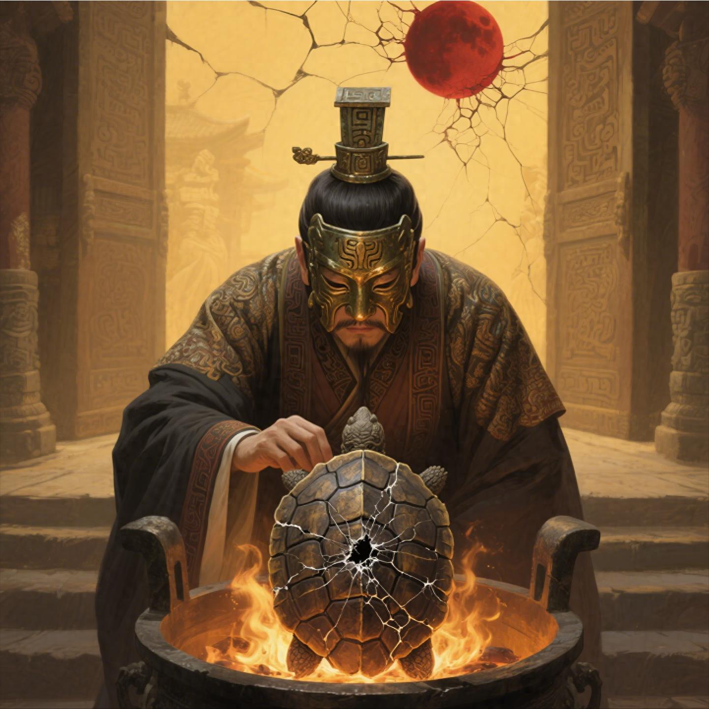 龟甲在火盆中发出细微的爆裂声,裂纹如蛛网般在炭黑的纹路间蔓延。商王武丁俯身凝视着这些神秘的符号,青铜面具下的呼吸骤然急促 —— 裂纹组成的形状,竟与昨夜噩梦中的血月如出一辙。