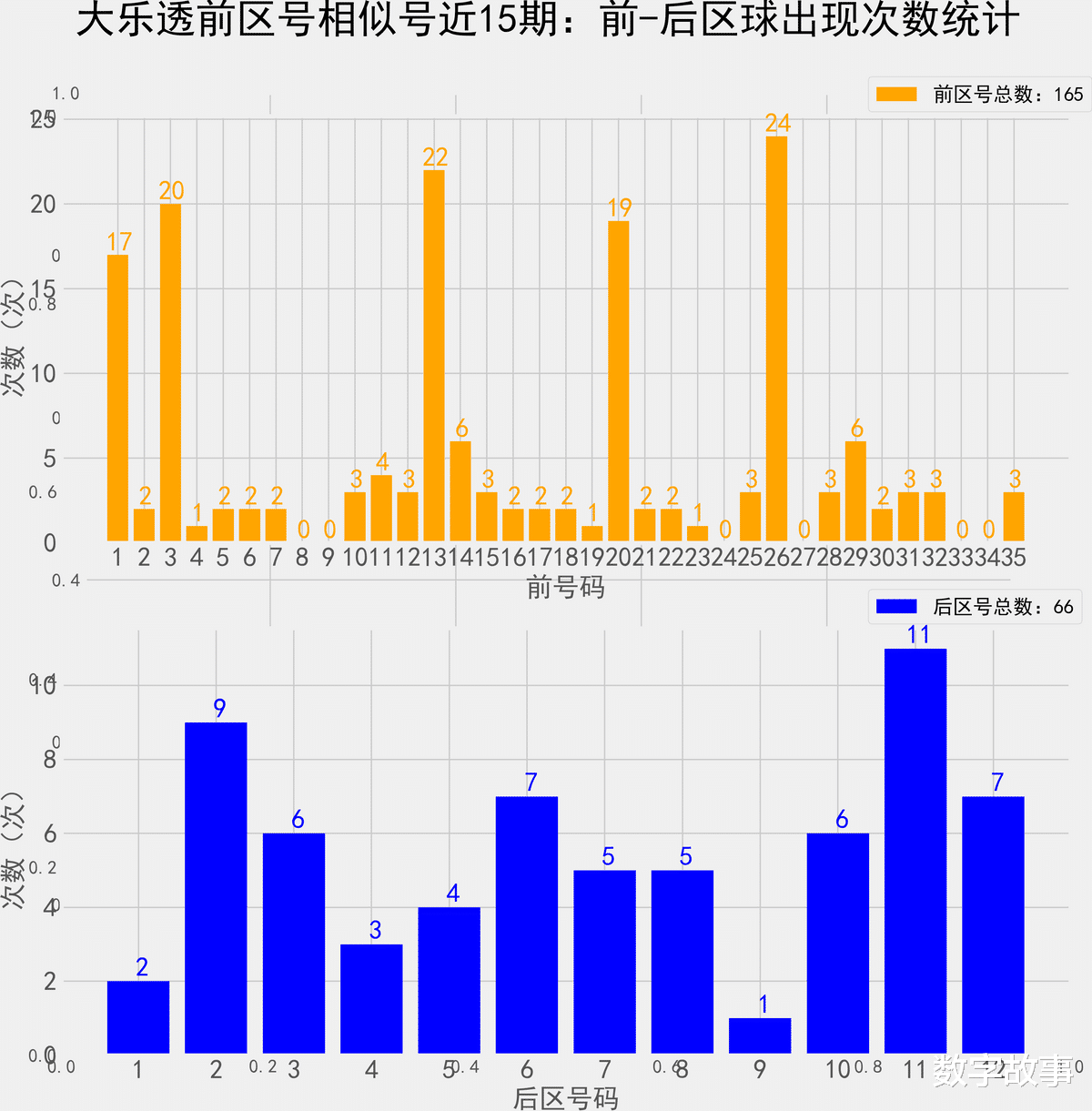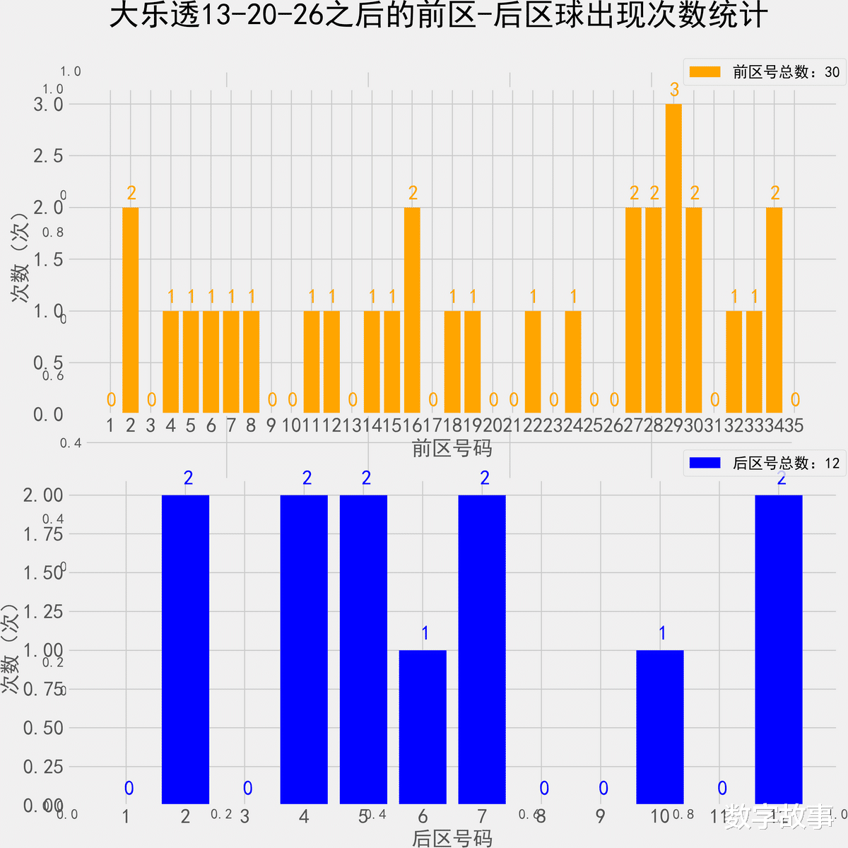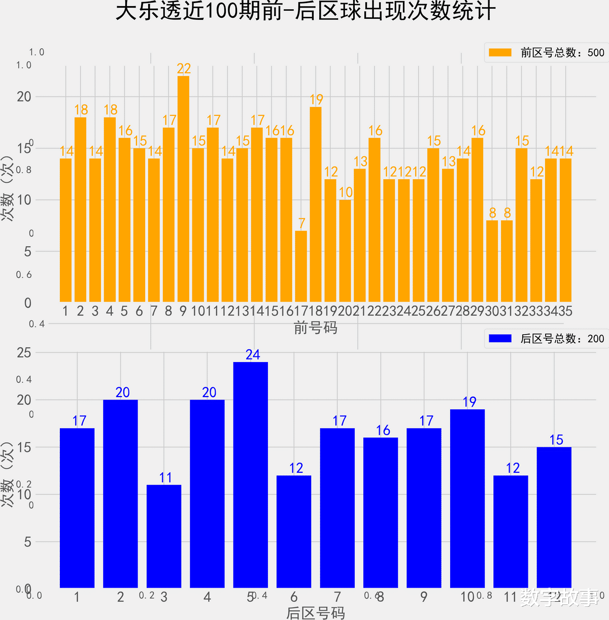 大乐透近100期前后区号统计情况统计样本数据: 500个前区号码 200个后区号码