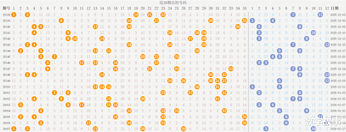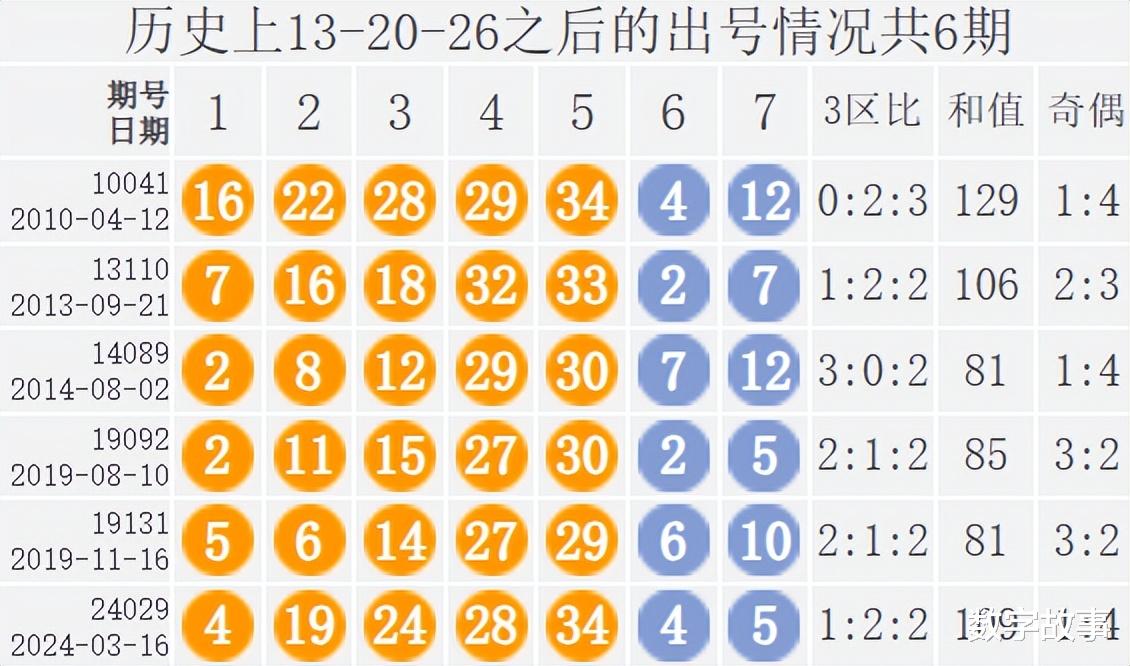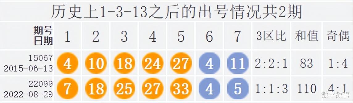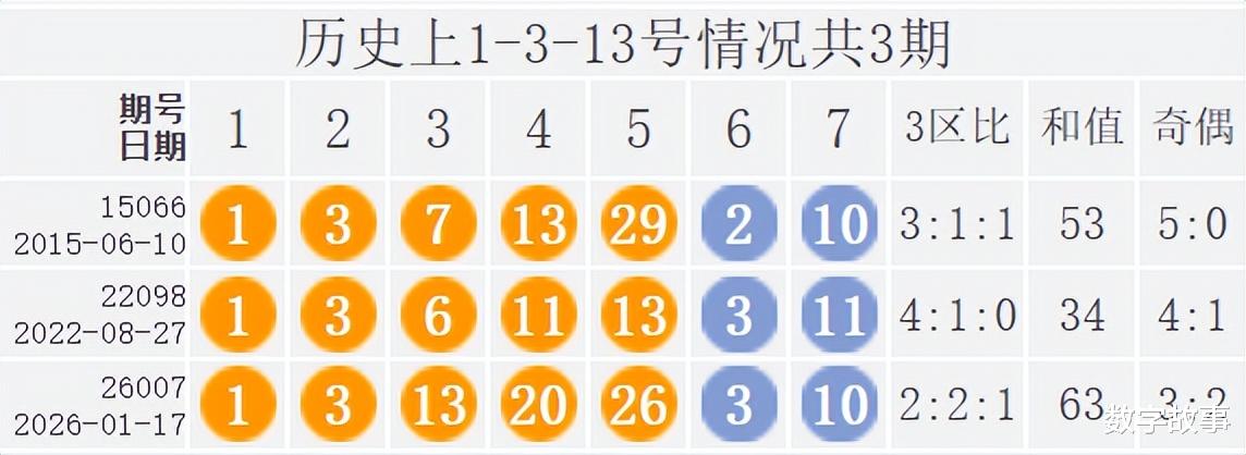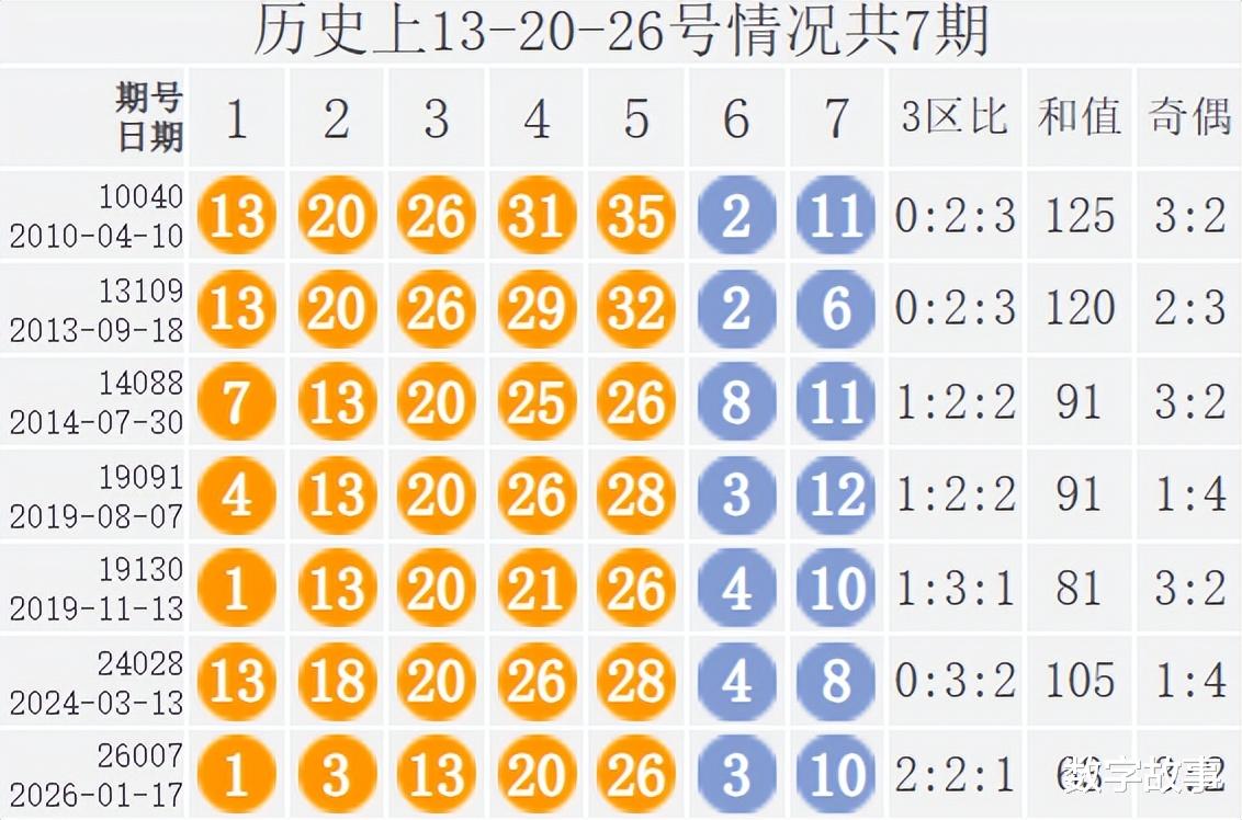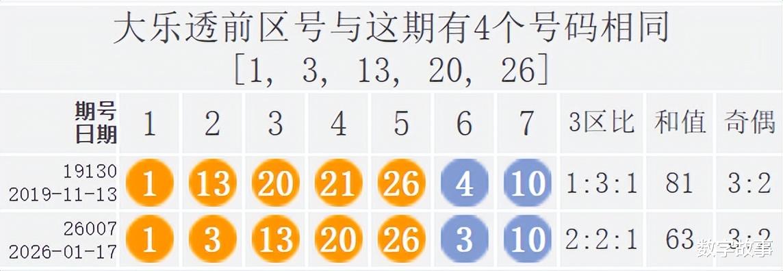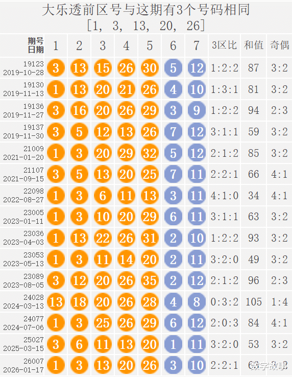 大乐透26007期前区号在过去是否出现过?大乐透26007期前区号: 1-3-13-20-26经查,历史上没有出现过与这一期5个前区号一样的,4个前区号一样的有1期,如下: