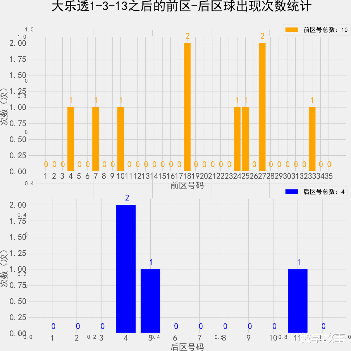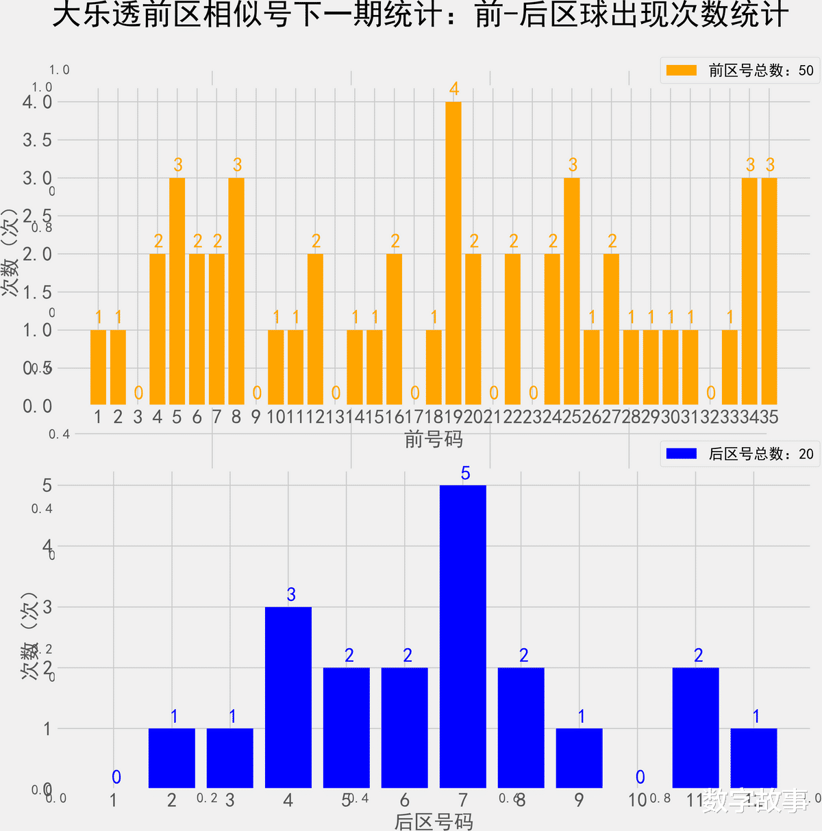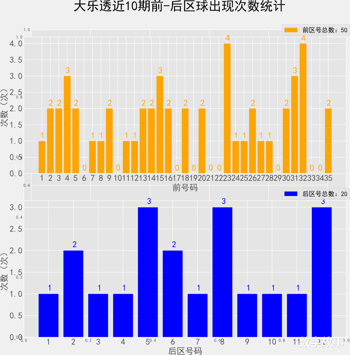 大乐透近10期前后区号统计情况统计样本数据: 50个前区号码 20个后区号码