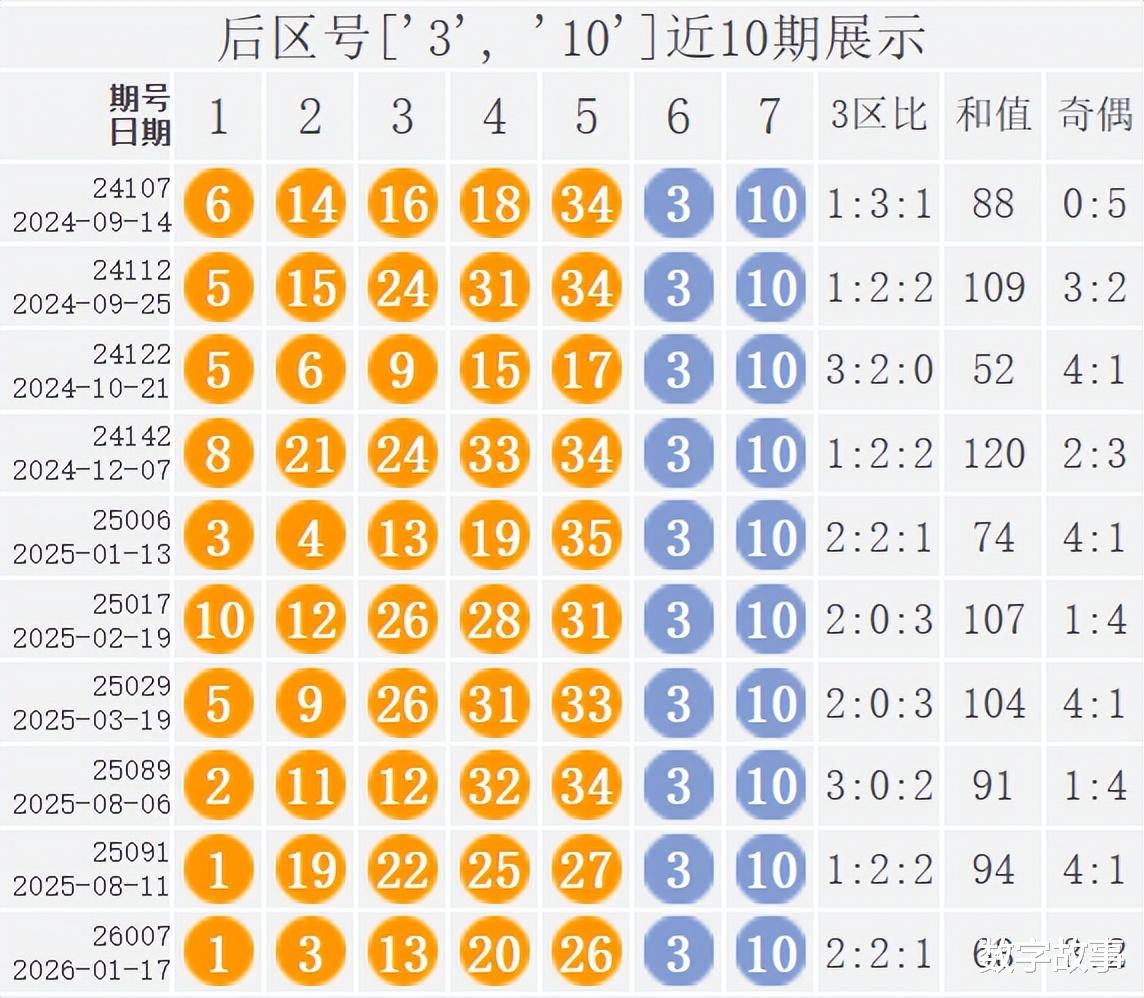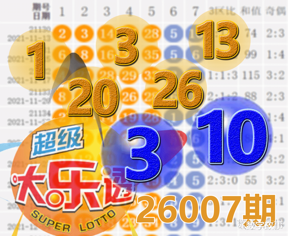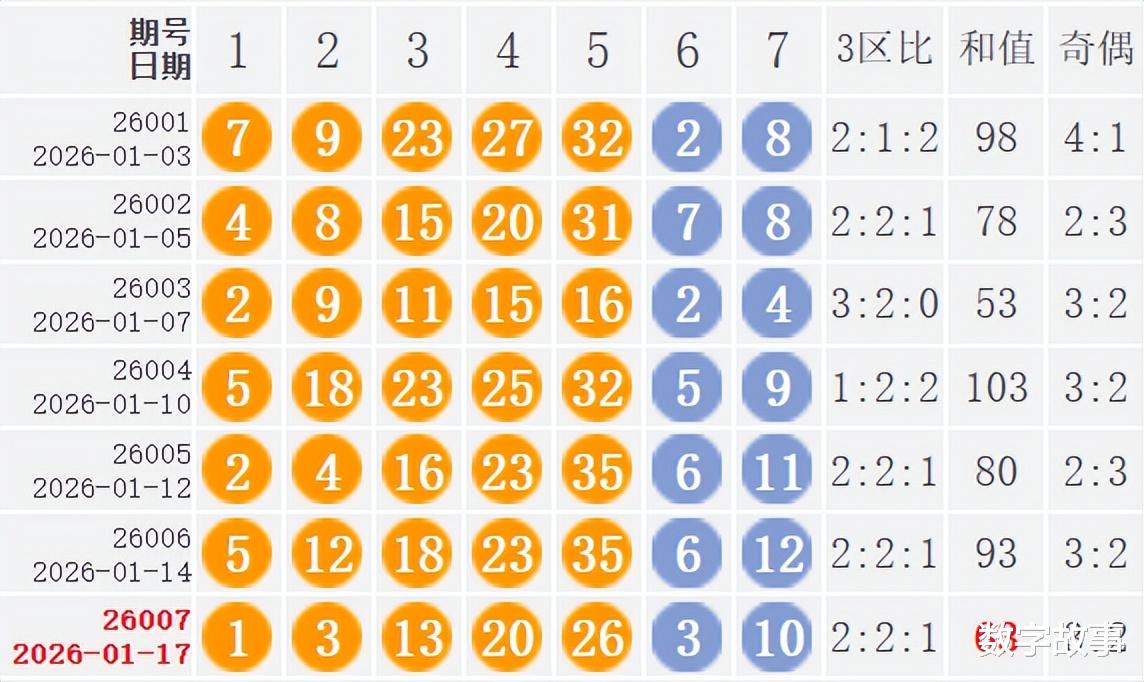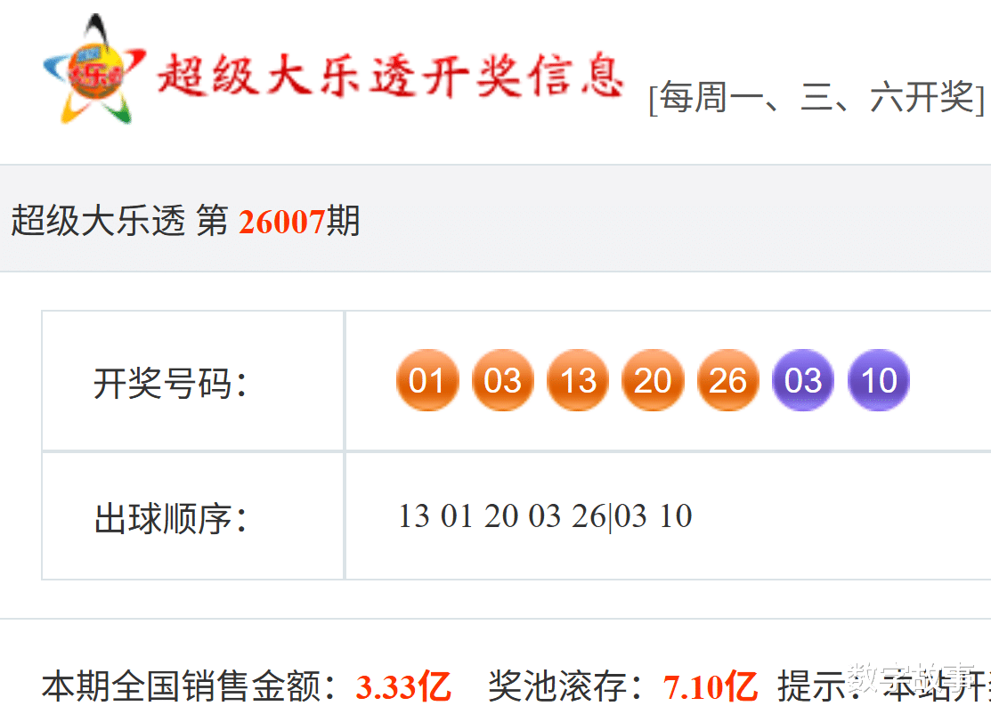 大乐透26007期开奖结果及中奖情况:出奖时间: 2026-01-17 星期六 前区号:1-3-13-20-26后区号:3-10没有上一期的重号 大乐透前区奇偶比:3:2 前区和值:63前区跨度:25 三区比:2:2:1没有连号