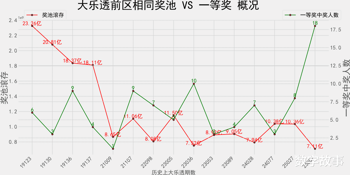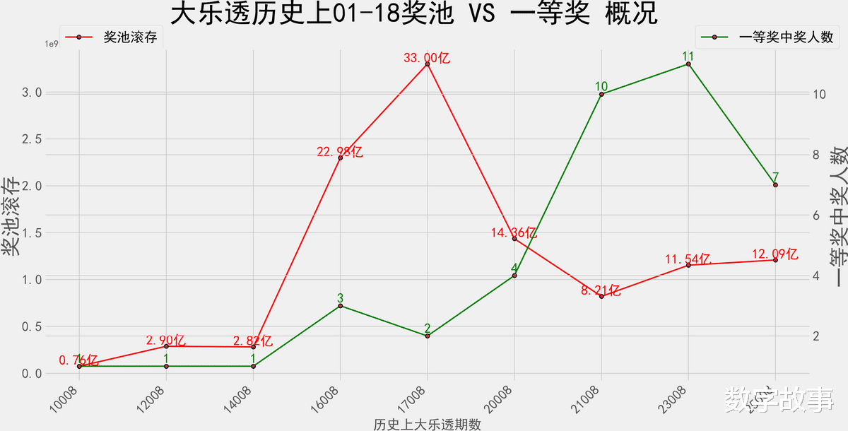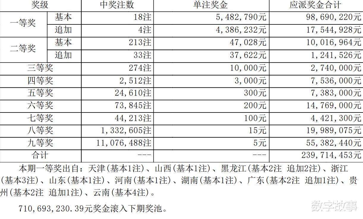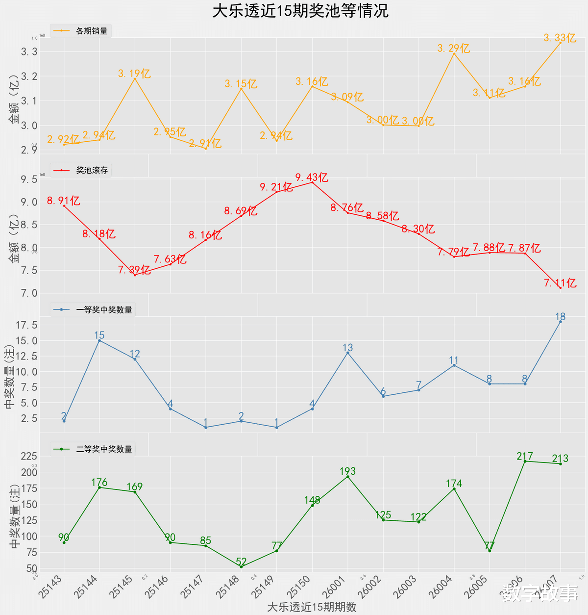 大乐透26007期一等奖:18注,追加: 4注二等奖:213注,追加: 33注。本期全国销售金额:3.335 亿 奖池滚存:7.107 亿.近15期奖池滚存, 中奖情况等信息: