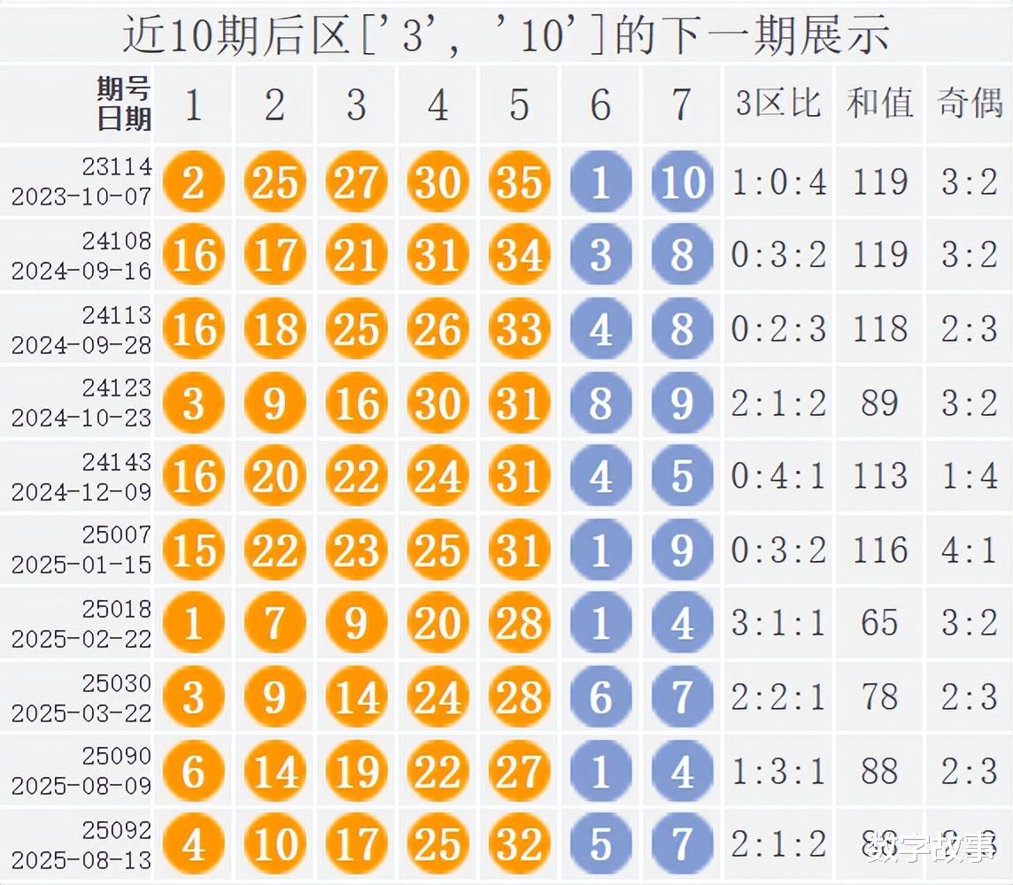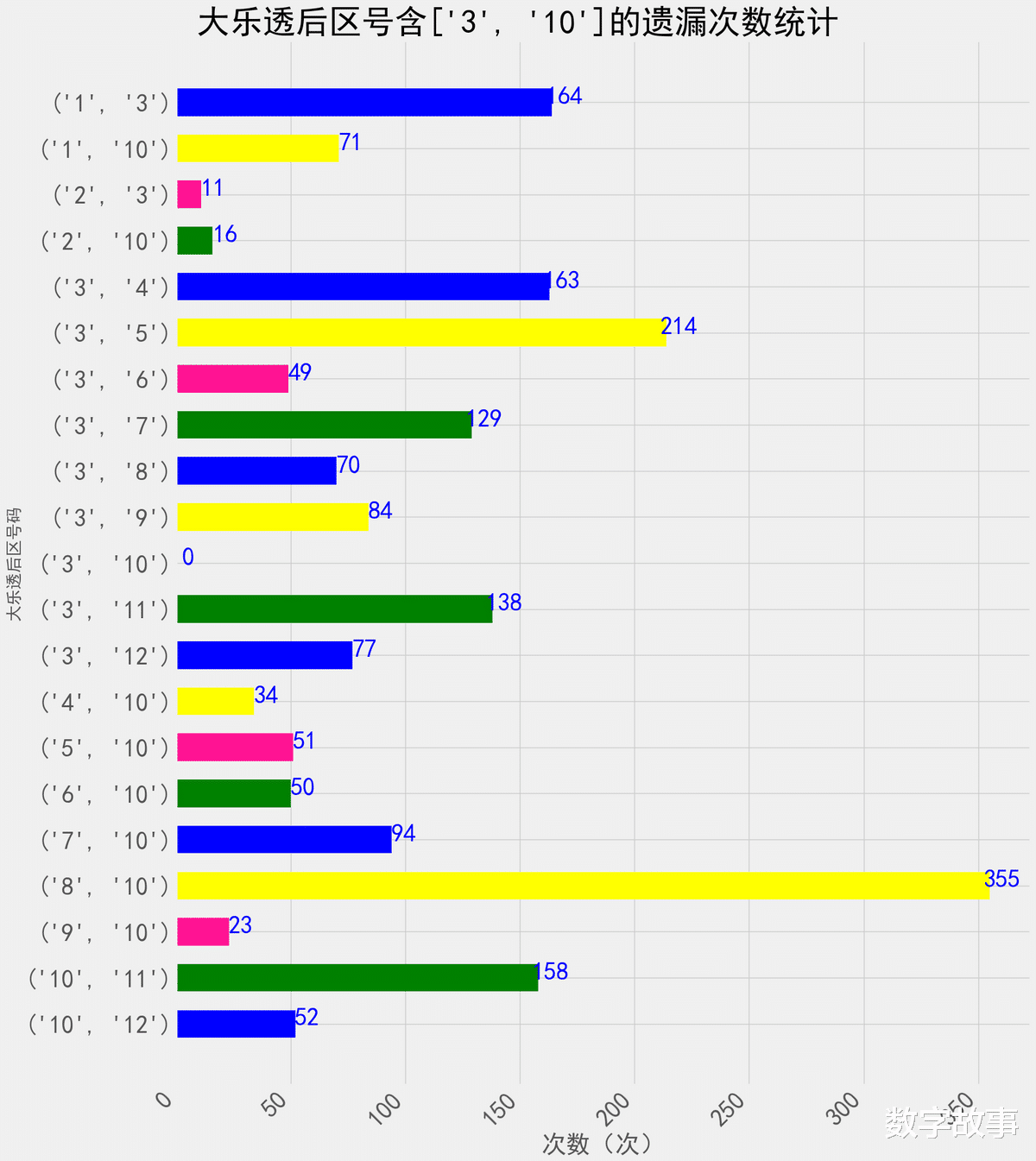大乐透后区含3或10的双号遗漏次数统计大乐透后区组合3-10近150期出了5次,这次中断了65期遗漏。