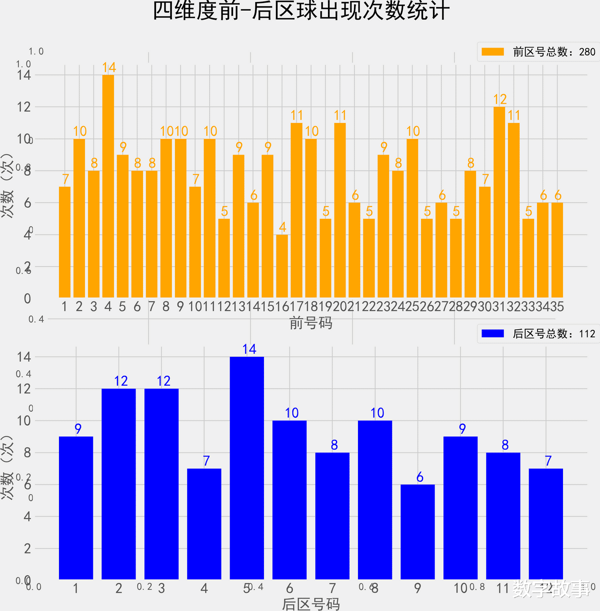 => 统计出现概率综合以上4个纬度的号码,共56期根据出现次数,分为热号,冷号,其他的为温号。统计样本数据: 280个前区号码 112个后区号码