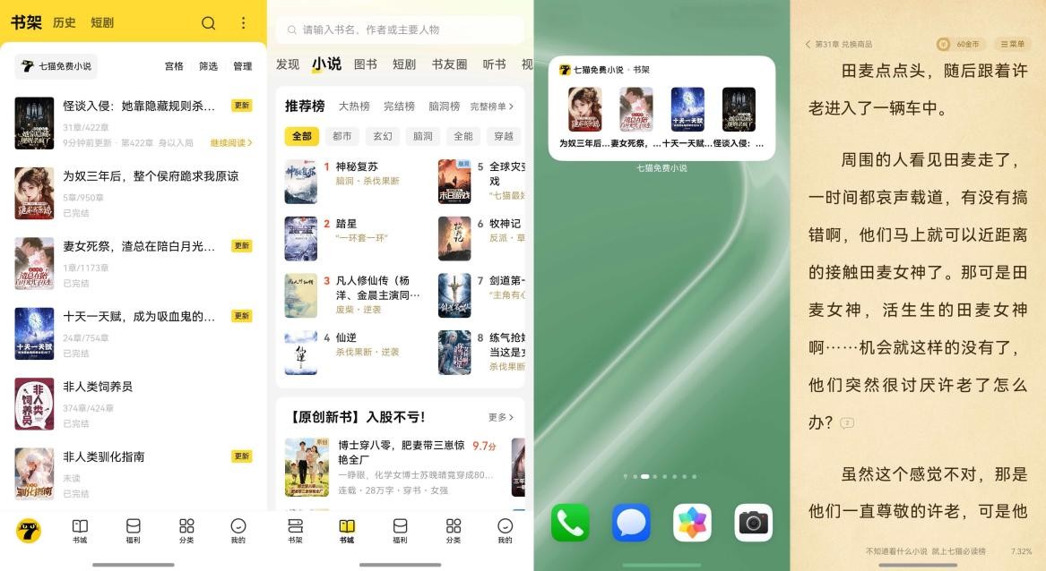 放假在家,休闲阅读基本是我打发时间的首选。以前追各种逆袭爽文,最麻烦的就是设备切换。现在我用上了鸿蒙版七猫免费小说,可算吃上了这个跨设备接续的“细糠”:在客厅沙发上躺着用手机看小说,回到卧室,把手机和平板一靠近,不仅阅读进度直接同步过去了,页面也会一同流转过去。我还很喜欢它的服务卡片功能,把“书架”卡片放在手机桌面,点一下就能直接跳转到没看完的书,不用先找APP再找书了。