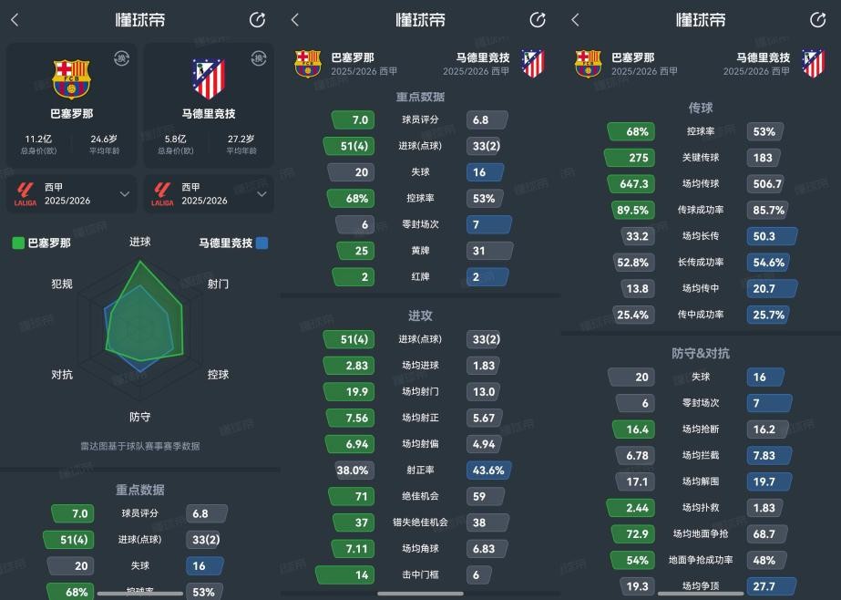 作为资深球迷,今年在鸿蒙生态里看球赛的体验也有升级。我常用的是鸿蒙版懂球帝,今年上线了“球队PK”和“球员PK”功能。比如想比马竞和巴萨这个赛季的表现,一个雷达图就能看清两队进攻、防守的强弱项,数据还非常直观。我也会把它的观赛服务卡片固定在手机桌面上,重要的比赛时间和实时比分,不用点开应用也能一眼看到。