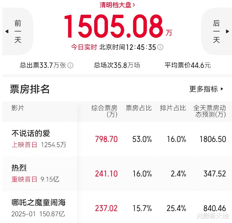 从4月3日排片来看,尽管《哪吒2》的排片占比仍以25.4%排在第一,但票房占比已经跌至第三位,张艺兴主演的《不说话的爱》16%的排片拿到超过53%的票房,排片占比只有2.4%的重映电影《热烈》单日票房也排在了《哪吒2》之上。