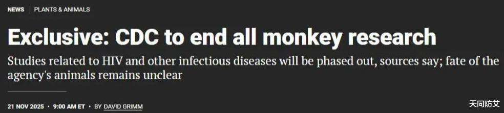 近日,《科学》(Science)杂志发布了一篇名为《独家报道:美国疾控中心将终止所有猴子研究》的文章。