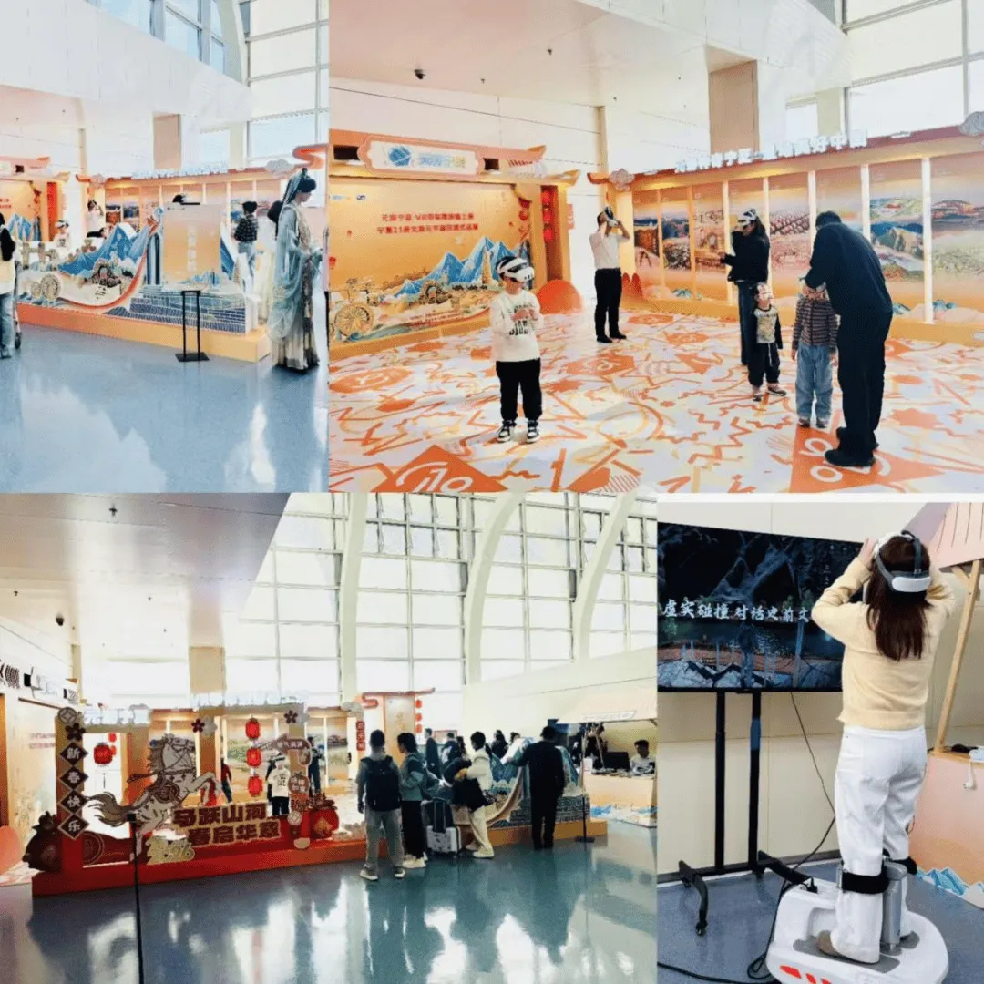 此次活动在机场T3航站楼内设立了集中式沉浸体验区。旅客在该区域可一站式体验多个项目,涵盖VR大空间漫游、宁夏21景新年主题展陈、数字设备交互体验以及特色非遗文化展示等。
