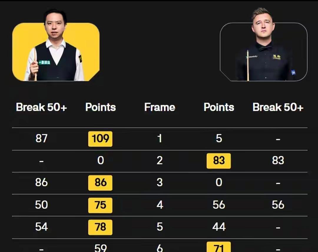 比赛伊始,双方迅速进入状态,没有过多的试探便展开了激烈的对攻。周跃龙在比赛中展现出了极佳的竞技状态,他在攻防转换的处理上显得游刃有余。全场比赛,周跃龙手感火热,轰出了一杆破百的116分,展现了其强大的得分能力。此外,他还贡献了两杆50+的高分,分别是单杆50分和61分,这种持续的高分输出成为了他取胜的关键基石。