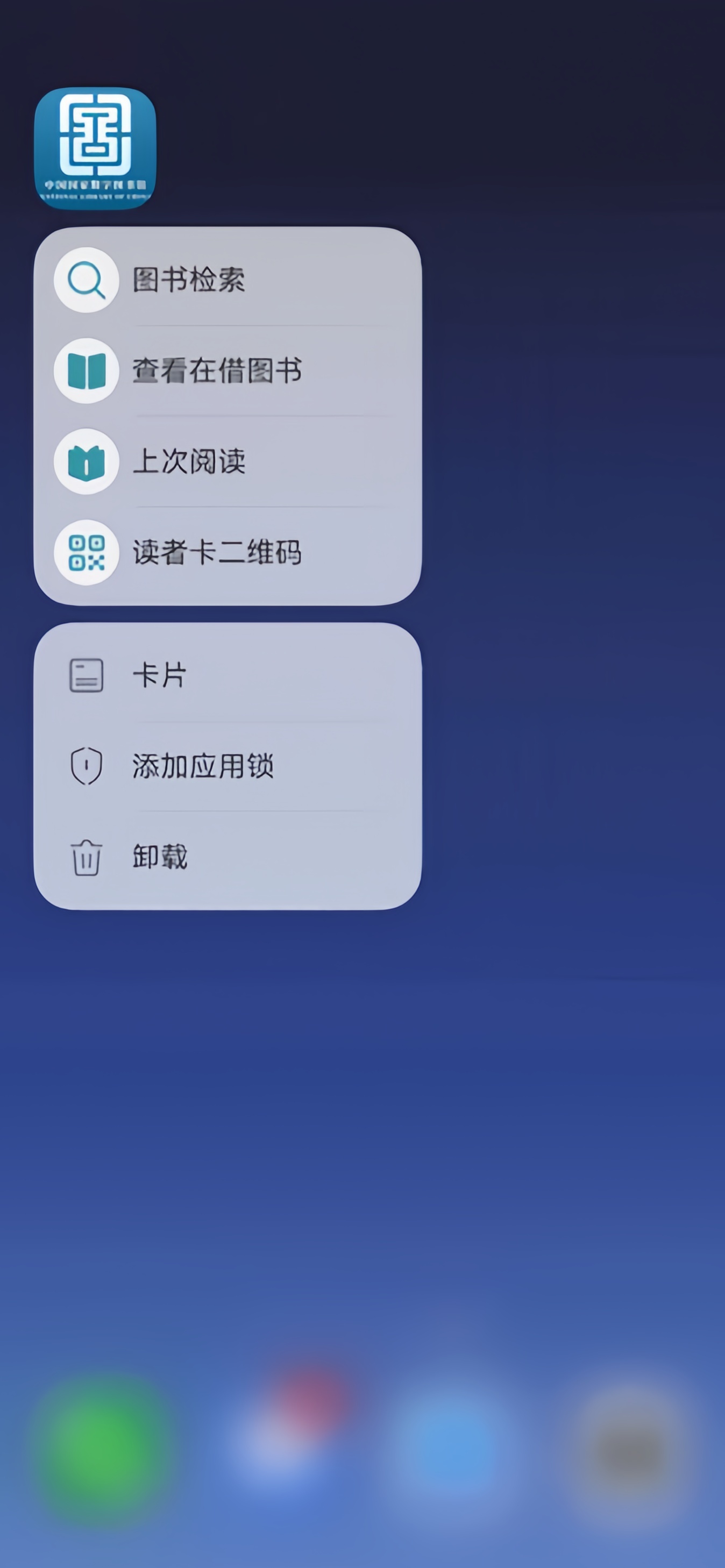 常用功能快捷入口一键启动:长按桌面App图标,可快速启用“图书检索”、“查看在借图书”、“上次阅读”、“读者卡二维码”等常用功能,便捷更高效。