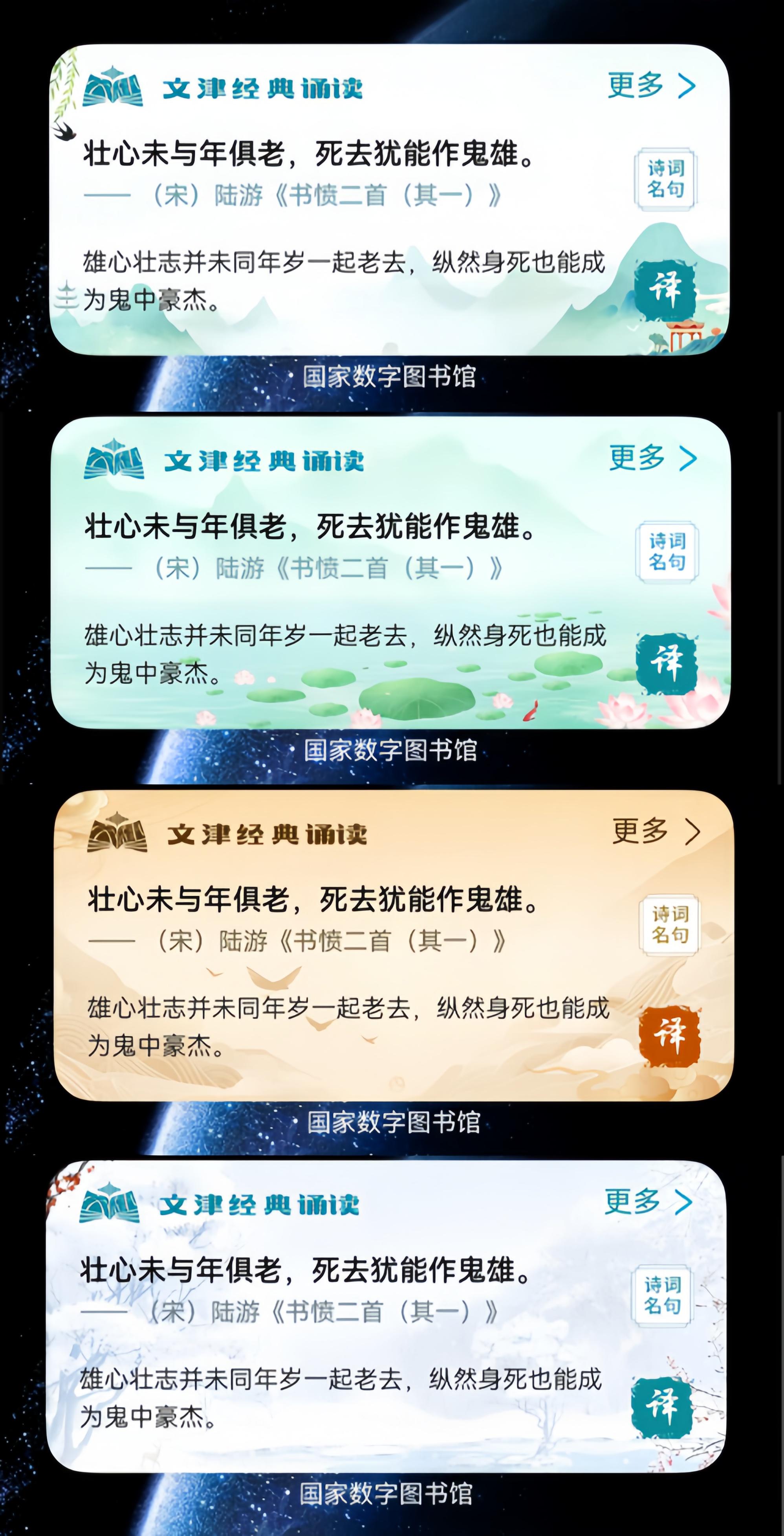 桌面服务卡片便捷更美观:长按App图标将“文津经典诵读”服务卡片添加至桌面,该卡片每日将推送一首经典诗词,配以诗词译文等内容。卡片设计还会随四季更迭动态更新主题,让日常知识积累更添生活温度。