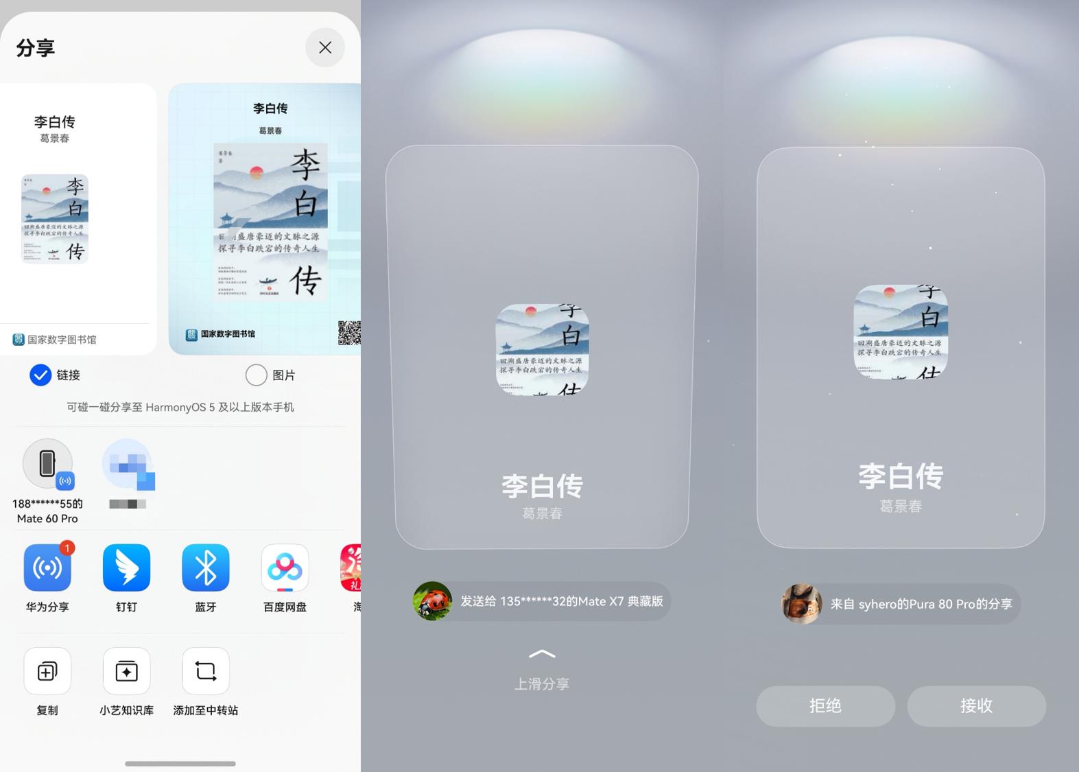华为分享+碰一碰,知识分享更简单:新增华为分享入口,支持将图书资源以链接、图片等形式快速分享;若双方均为鸿蒙设备,只需顶部轻碰后上滑,轻松实现书籍秒传,让知识自由穿梭;