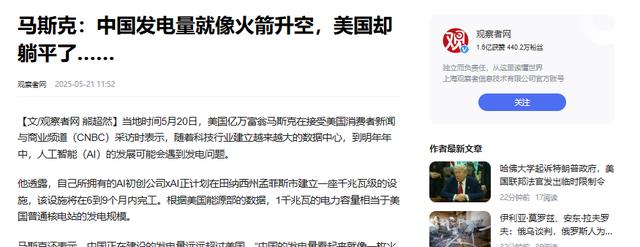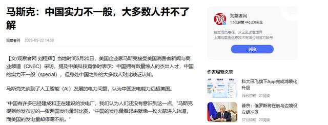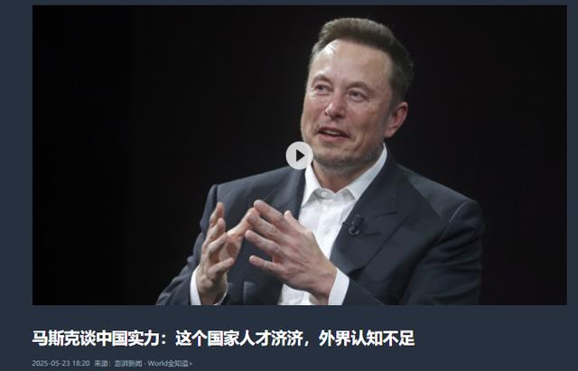 马斯克:中国实力不一般,大多数人并不了解.观察者网.2025-05-22