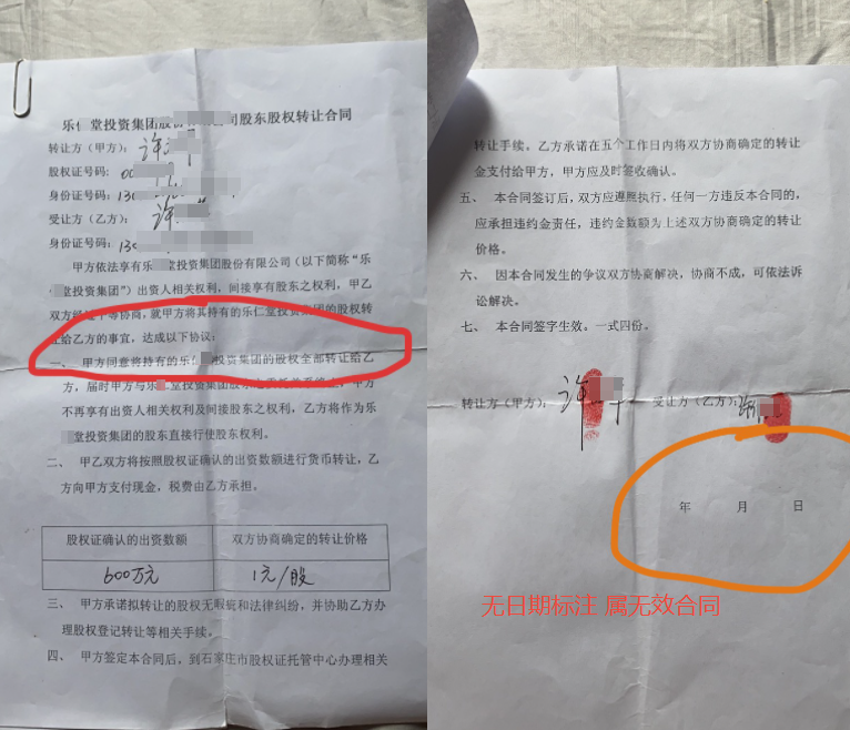 二、财产欺诈:六百万股权成空谈 多重造假妄图侵吞离婚后财产分配极不公,许某军仅分给侯女士一套24万元老旧房产,婚内共同创业的乐某堂股份也分文未得。离婚协议明确约定“赠予女儿乐某堂12%股份(对应600万股权)”,但他给女儿办理的股权证,加盖的是早已作废的公章,既无经办人也无签署日期,纯属无效假证;四份股东转让协议亦无日期,本质也是无效协议。许某军自2014年离婚至2025年始终无履行离婚协议的意愿,已构成违约,其转移财产行为还涉嫌违反《民法典》第一千零九十二条。