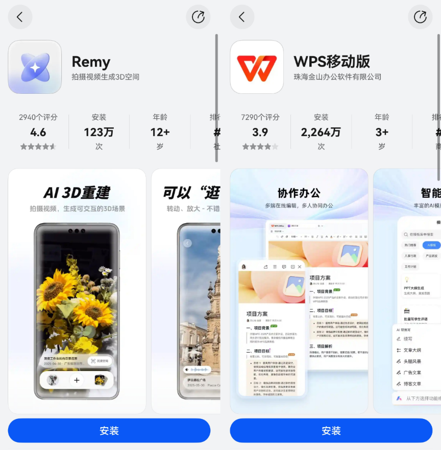 例如,喜欢记录生活的用户会爱上鸿蒙独家应用《Remy》,它能像保存普通照片一样存储和查看3D影像,碰一碰即可分享。常用平板办公的人,则不可错过鸿蒙版《WPS移动版》,手机与平板间碰传编辑、即拍即插PPT,高效便捷。