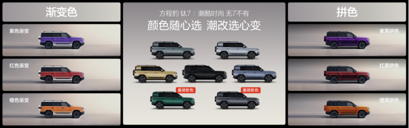 为了让广大用户选得尽兴,钛7直接一步到位,带来了7款外观颜色、3款内饰颜色,同步在官方商城上架了6款潮改方案,可满足不同用户的审美偏好。
