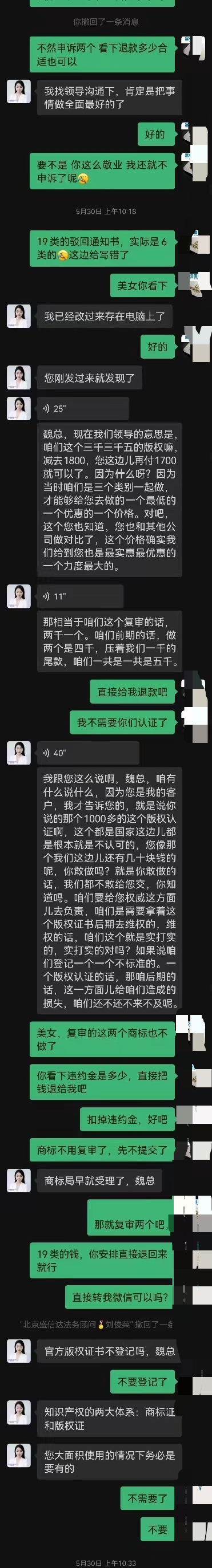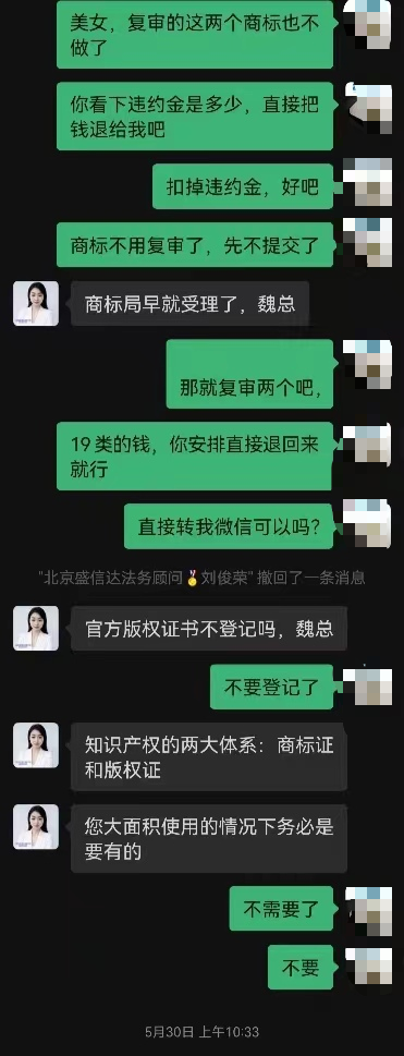 5月22日,盛信达联系我,告知我此前提交的三个商标(第6、19、20类)均未通过初审,并承诺若委托其进行复审,即可取得商标证书。5月24日,基于对方“律师撰写文书、法务全程跟进、保证复审通过概率”的承诺,我同意委托其对三个商标开展复审。5月27日,我原注册代理公司通知,第19类商标已全部通过初审,不具备复审资格,仅第6类和第20类被驳回,可提出复审。5月30日,我首次向盛信达说明第19类已通过初审的情况,要求退还该类别的复审费用,并同意扣除相应违约金。5月31日,我再次向盛信达说明该商标已通过初审、依法无法复审,要求扣除违约金后退还余款。盛信达业务员以“商标局已受理”为由拒绝退款,并拒绝停止其余类别的复审服务。经查询商标局官网,第6类和第20类的复审申请直至6月1日才提交,并未显示受理状态,其说法与事实不符。