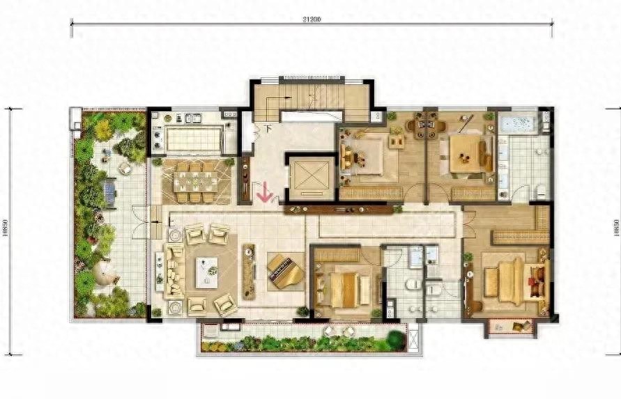 再看花园部分,左边是下沉式大花园。闲暇时光,在这里摆上一张躺椅,晒晒太阳、看看书,享受惬意的午后。不过南向花园相对较小,但也别有一番精致。