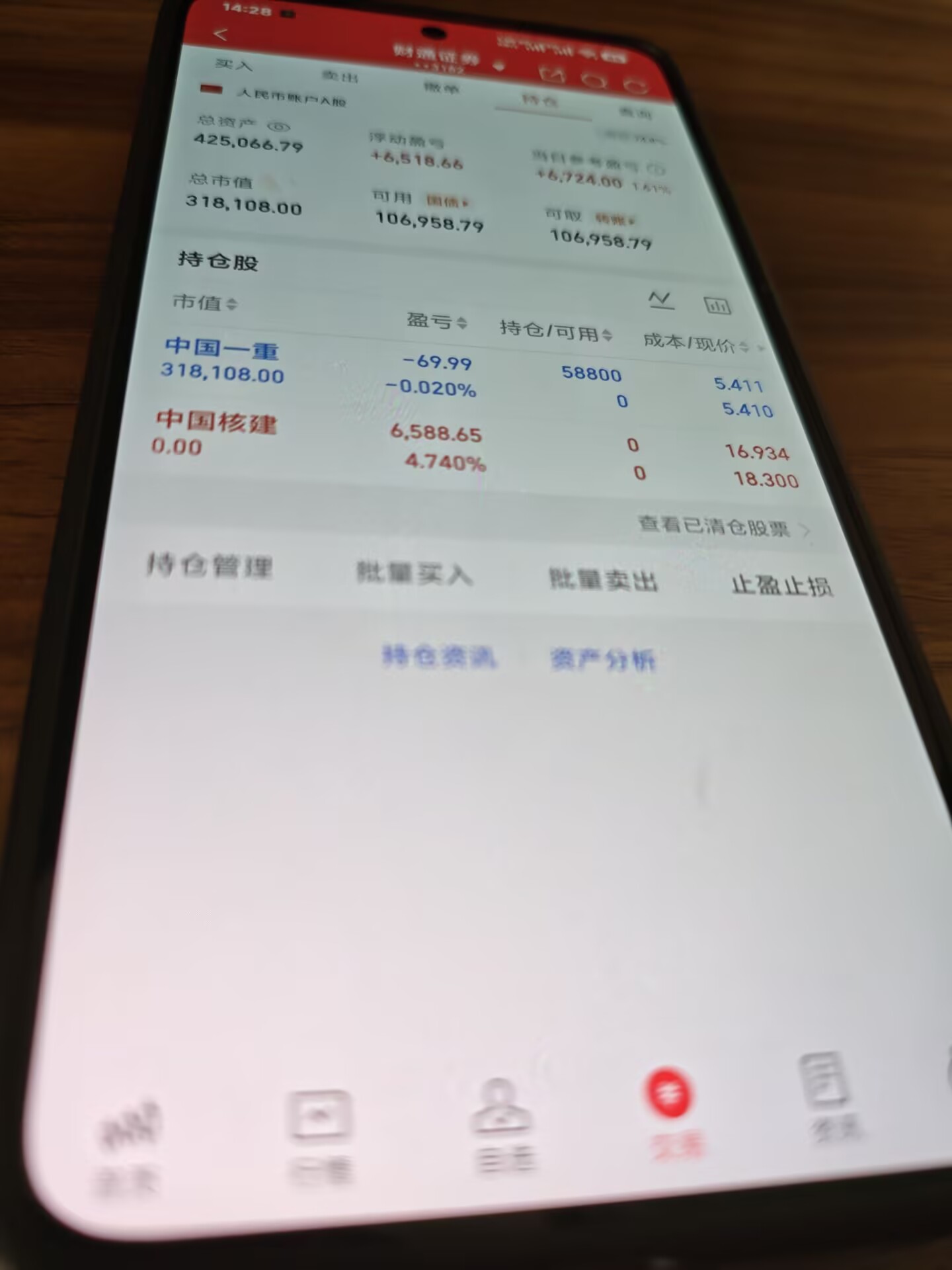 中国核建,冲高回落,红盘4个多点出掉了。它这个结构就很难连板,所以稍微冲一下,我就出了。如果不出,回落也会把我在开盘价,和平盘价设的两个卖出条件单打掉,自动成交。