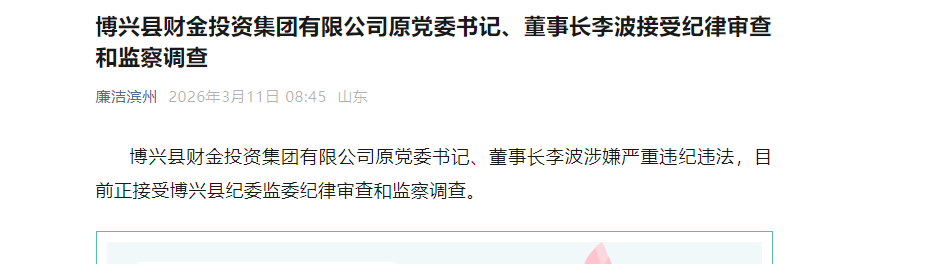 李波者,鲁地博兴人也。执掌博兴县财金投资集团有限公司,为党委书记、董事长,司一县之“钱袋子”,操国资之权柄,负保值增值之重托。其位之要,关乎亿兆民资之流向;其责之重,系乎地方金融之稳乱。然其终以“涉嫌严重违纪违法”,于丙午年二月四日(2026年3月11日)受博兴县纪委监委纪律审查与监察调查。昔时之“财神爷”,今成阶下囚,可叹可鉴。